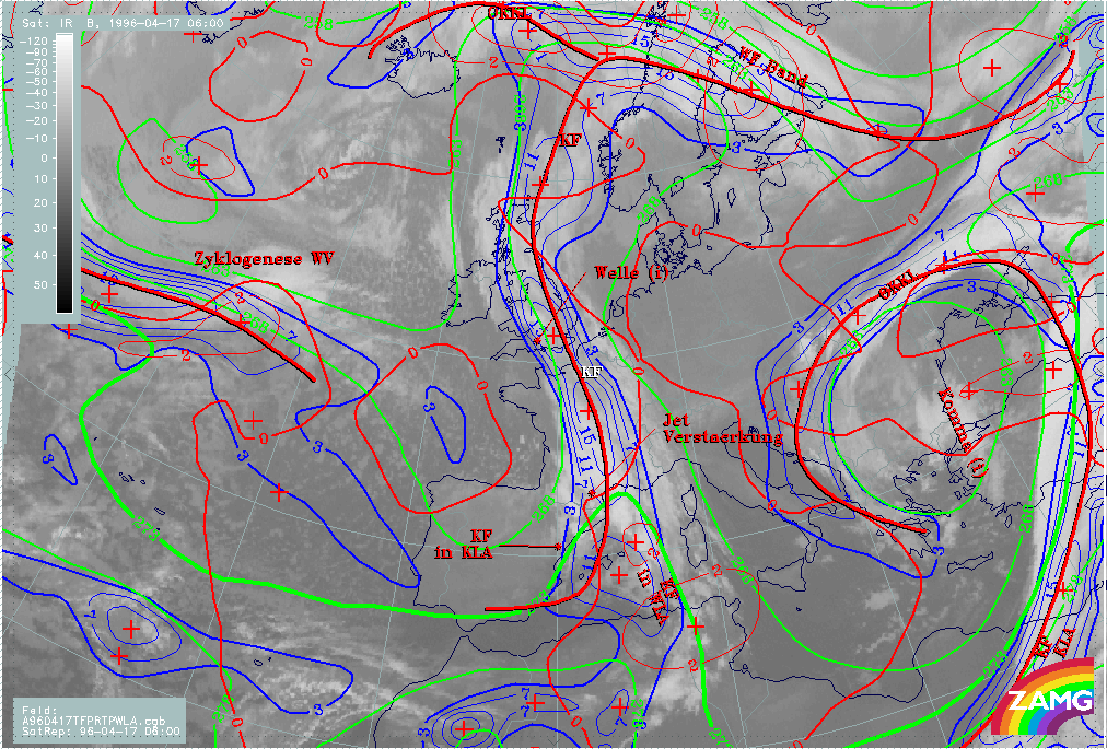 17 April 1996/06.00 UTC - Meteosat IR image; blue: thermal front parameter (TFP) 500/850 hPa, red thick: front indicator, green: