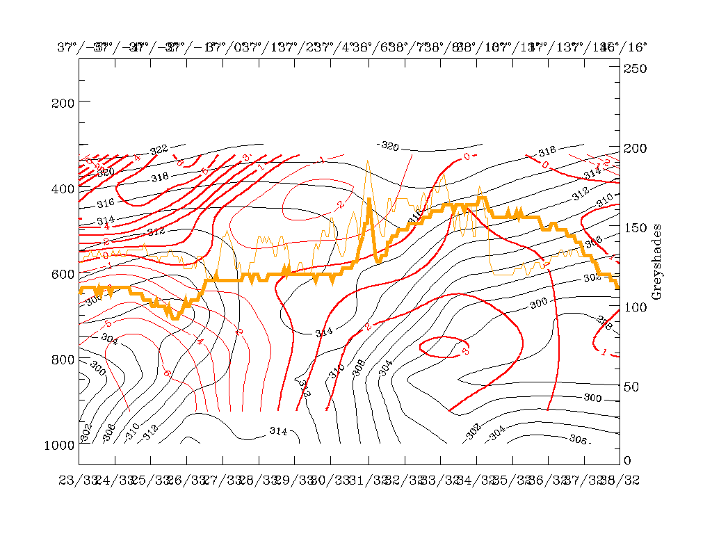 17 April 1996/06.00 UTC - Vertical cross section; black: isentropes (ThetaE), blue: relative humidity, orange thin: IR pixel values,