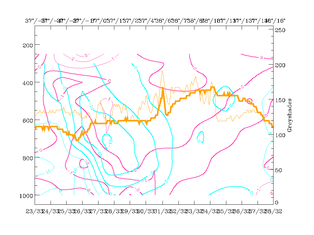 | Isot + PVA500>=2: | This is a combination of isotachs greater than 30 units (m sec-1) and positive vorticity advection (PVA) at 500 hPa greater than 2 units (*10-9sec-2); both parameter combinations locate the exit region and the PVA maximum in relation to the frontal cloud band |