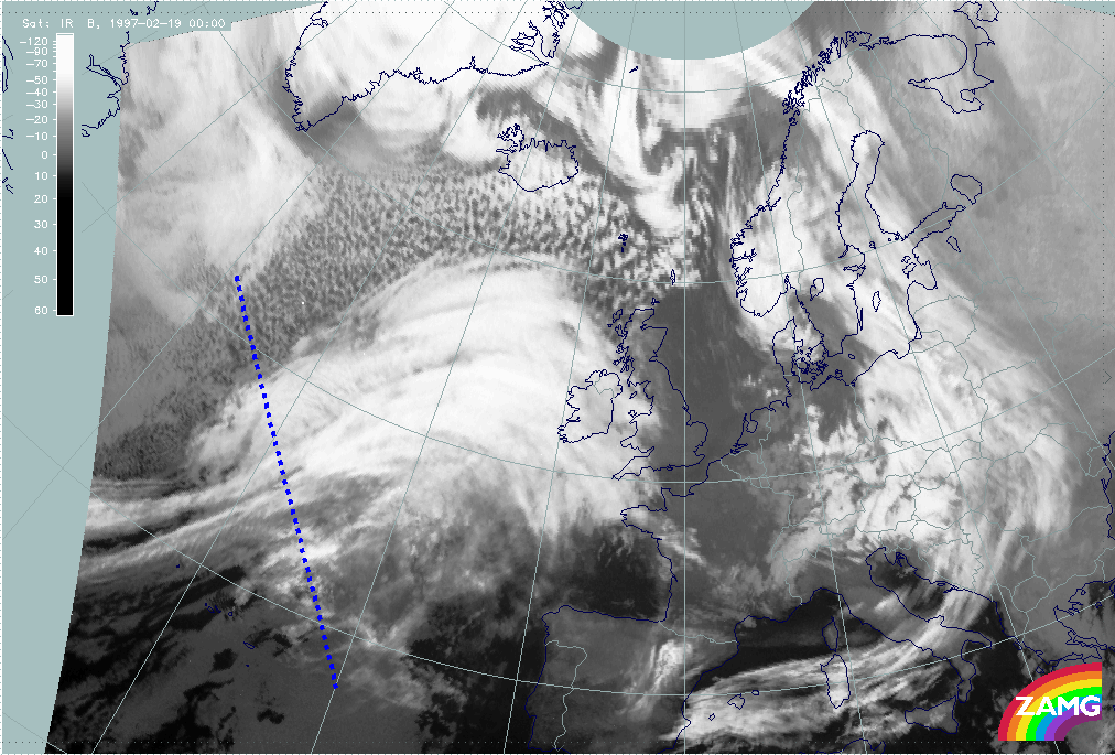 19 February 1997/00.00 UTC - Meteosat IR image; position of vertical cross section indicated