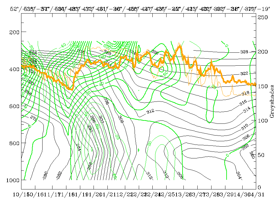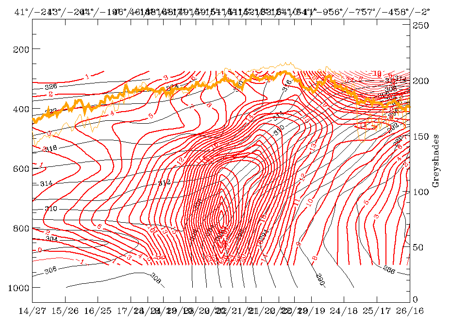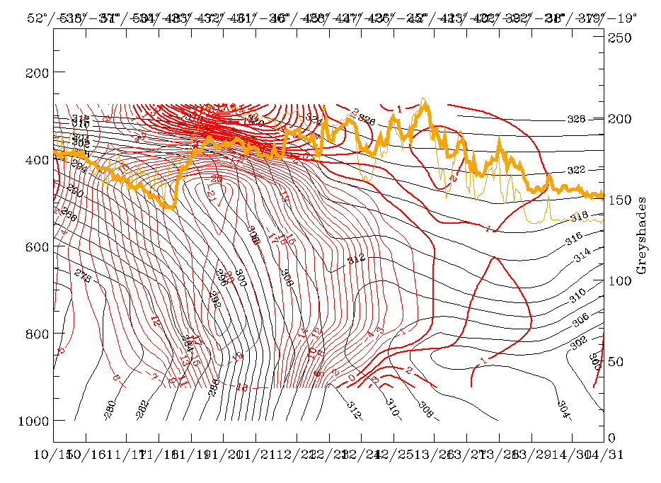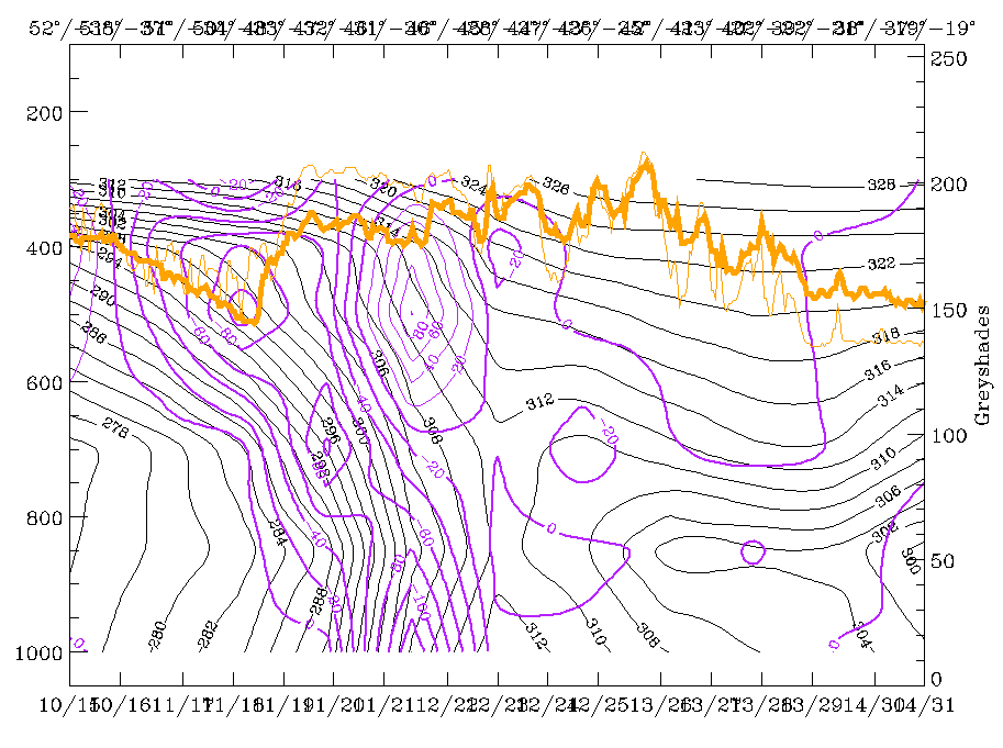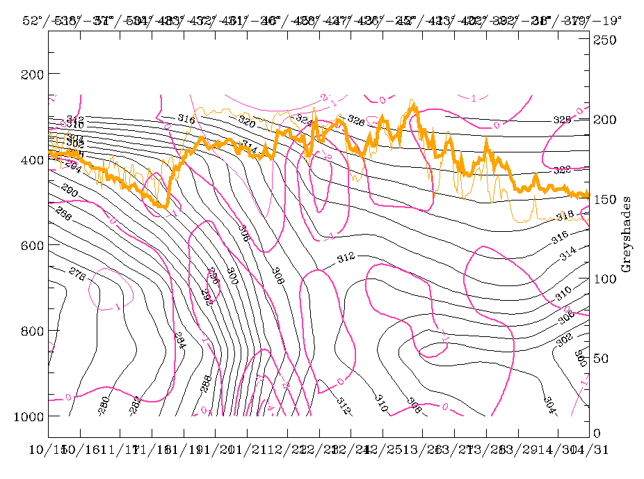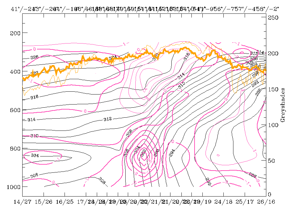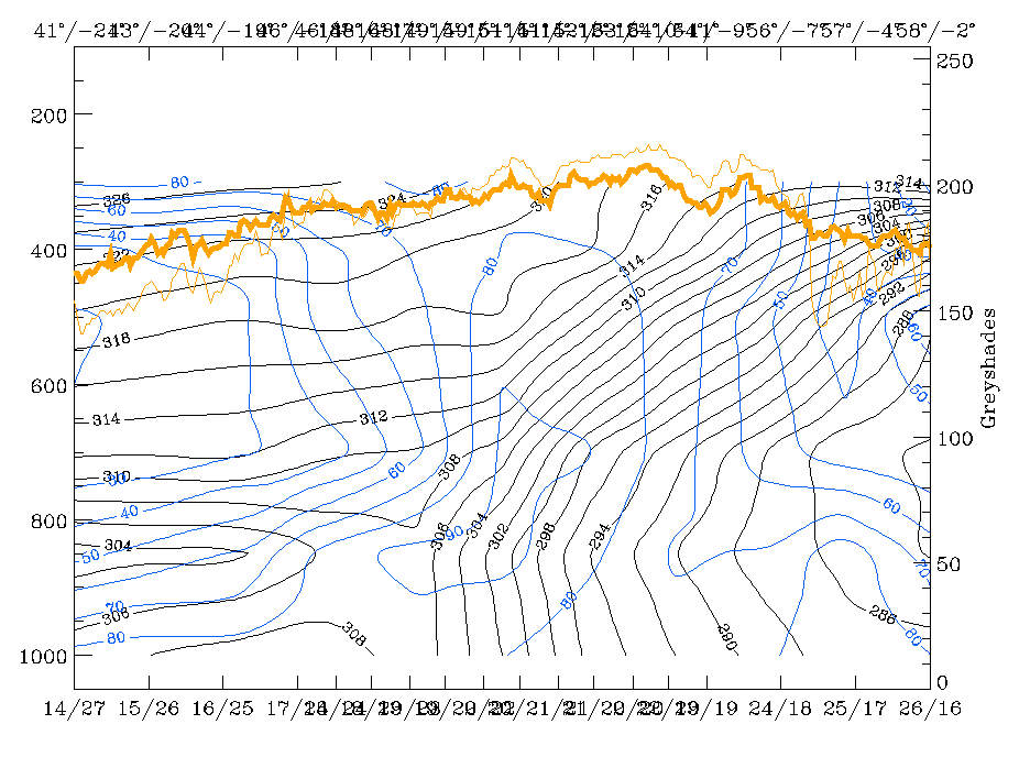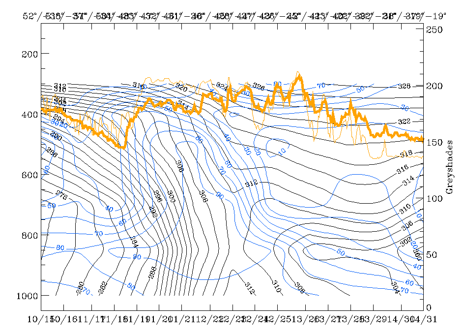 19 February 1997/00.00 UTC - Vertical cross section; black: isentropes (ThetaE), blue: relative humidity, orange thin: IR pixel values,
