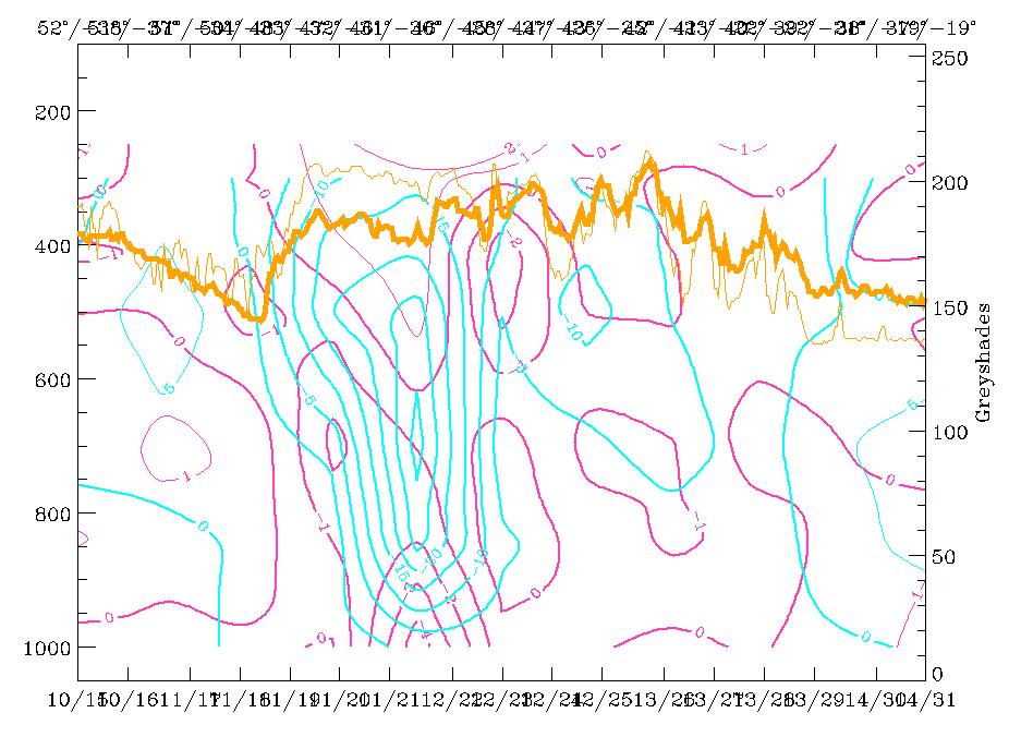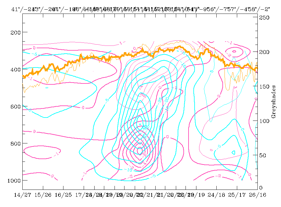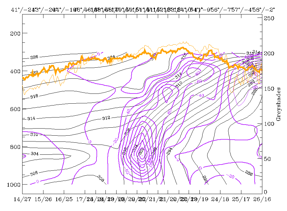19 February 1997/00.00 UTC - Vertical cross section; black: isentropes (ThetaE), lilac: Q-Vector (normal component), orange thin: IR