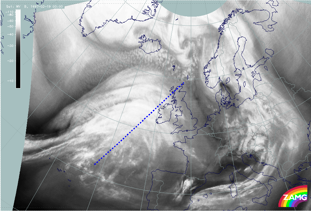 19 February 1997/00.00 UTC - Meteosat WV image; position of vertical cross section indicated