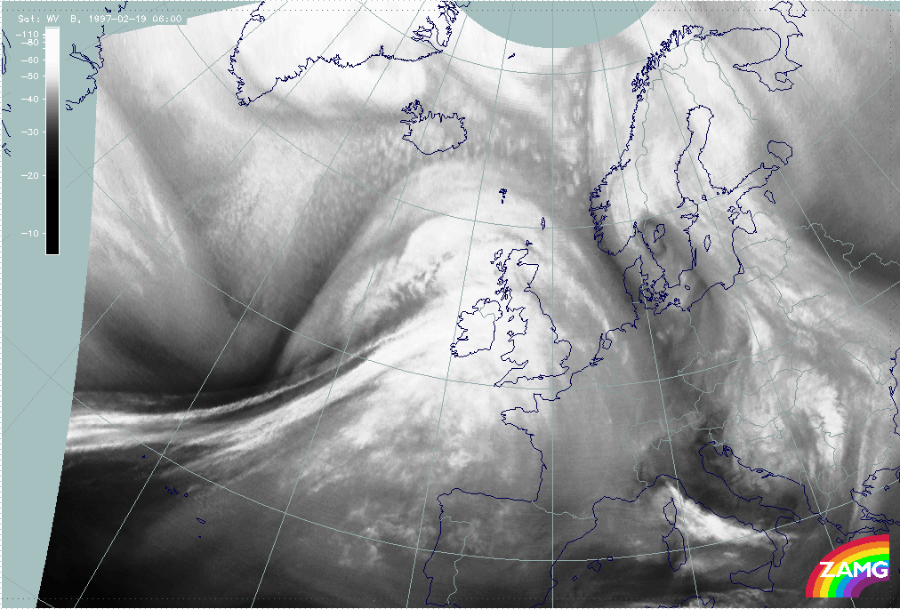 This black stripe separates the frontal cloud features from the cloud head to the north very distinctly. In contrast to the frontal features which have maintained their appearance during the last six hours, the cloud head has undergone many more changes. This will be discussed later in a separate chapter about Rapid Cyclogenesis and upper level features (compare Diagnosis of Rapid Cyclogenesis and Upper Level Trough Feature - 19 February 1997/00.00 UTC and Diagnosis of Rapid Cyclogenesis and Upper Level Trough Feature - 19 February 1997/06.00 UTC).