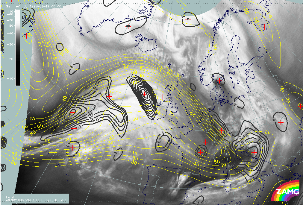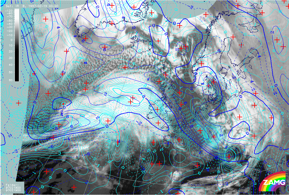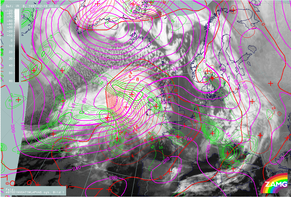 19 February 1997/00.00 UTC - Meteosat IR image; magenta: height contours 1000 hPa, green: positive vorticity advection (PVA) 500 hPa,