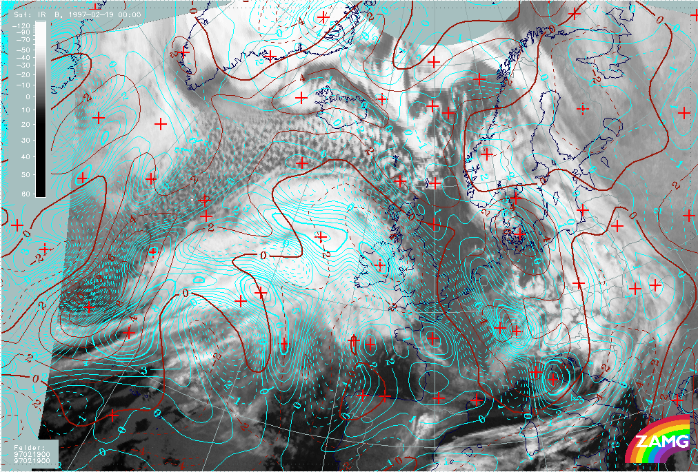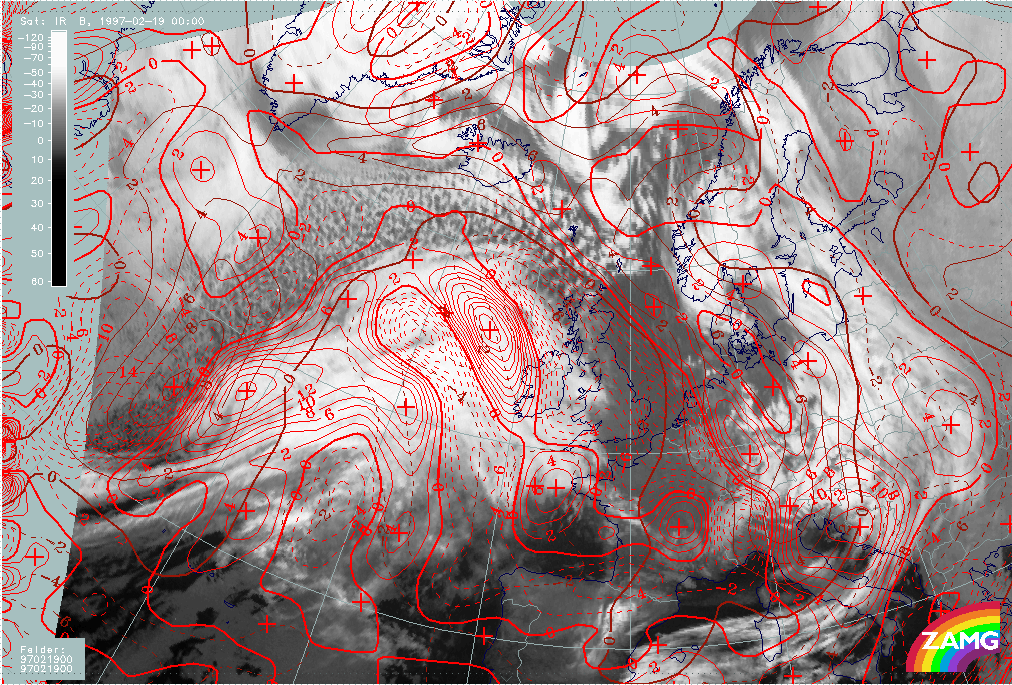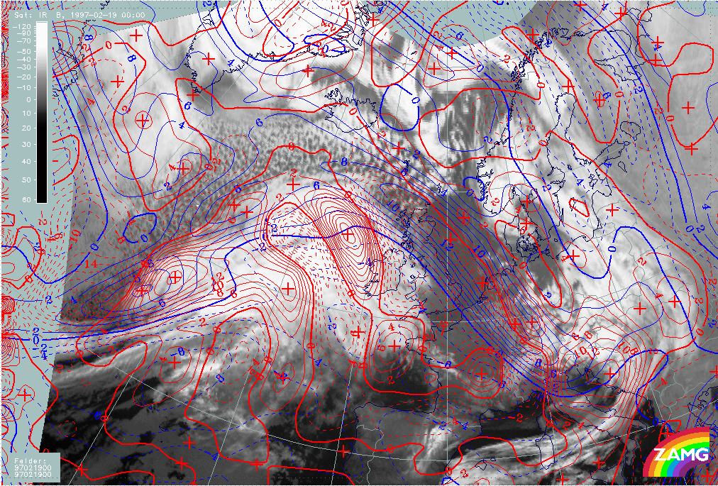19 February 1997/00.00 UTC - Meteosat IR image; red: vorticity advection 500 hPa, blue: shear vorticity 500 hPa
