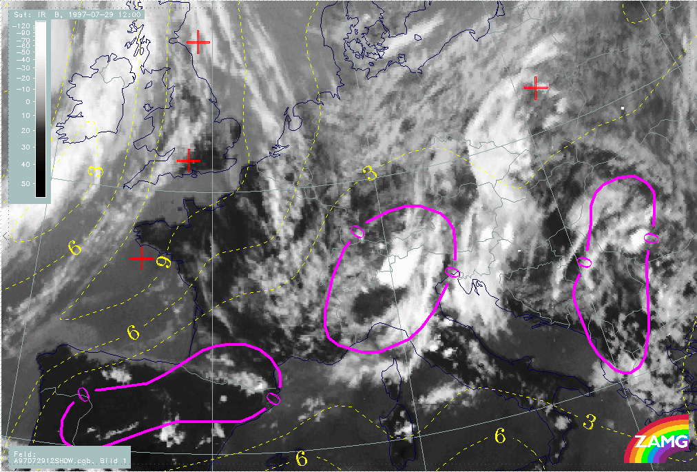 29 July 1997/12.00 UTC - Meteosat IR image; Showalter index 500/850 hPa, magenta: zero line of Showalter index 500/850 hPa