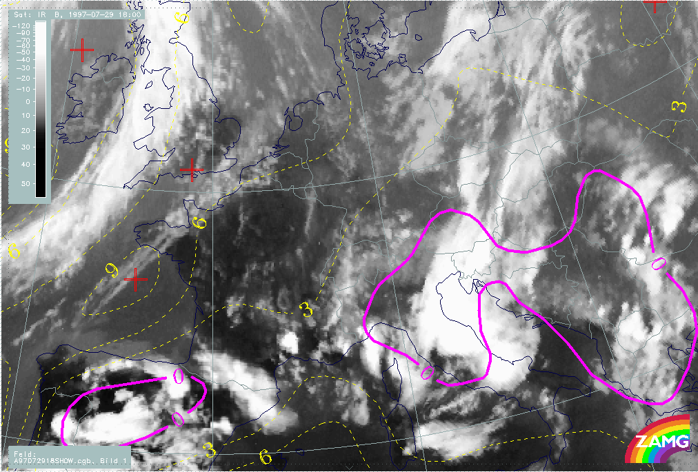 29 July 1997/18.00 UTC - Meteosat IR image; yellow: Showalter index 500/850 hPa, magenta: zero line of Showalter index 500/850 hPa