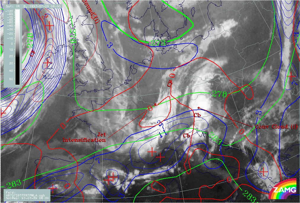 29 July 1997/06.00 UTC - Meteosat IR image; blue: thermal front parameter (TFP) 500/850 hPa, green: equivalent thickness 500/850 hPa,