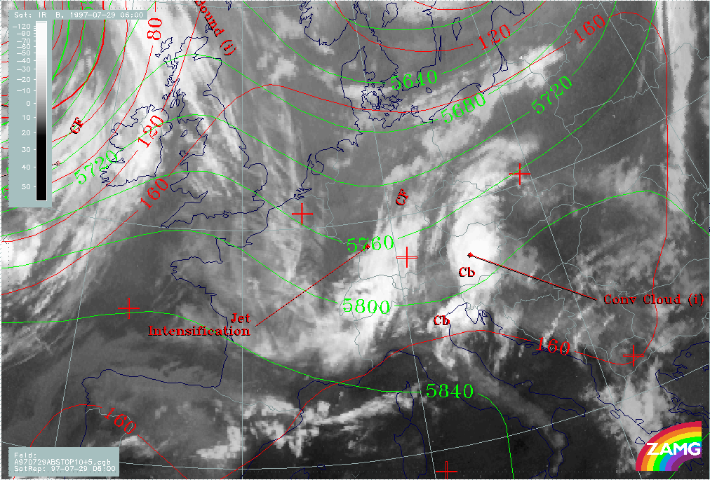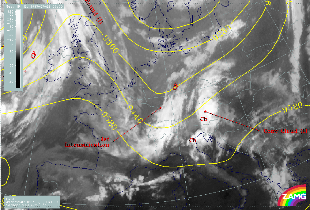 29 July 1997/06.00 UTC - Meteosat IR image; yellow: height contours 300 hPa; SatRep overlay: names of conceptual models