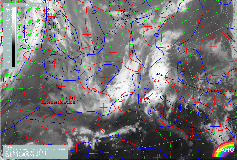 29 July 1997/06.00 UTC - Meteosat WV image; red: divergence 850 hPa, blue: divergence 700 hPa; green: wind vectors 850 hPa; SatRep