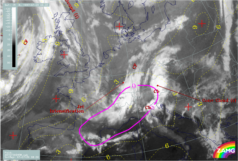 29 July 1997/06.00 UTC - Meteosat WV image; yellow: Showalter index 500/850 hPa, magenta: zero line of Showalter index 500/850 hPa;