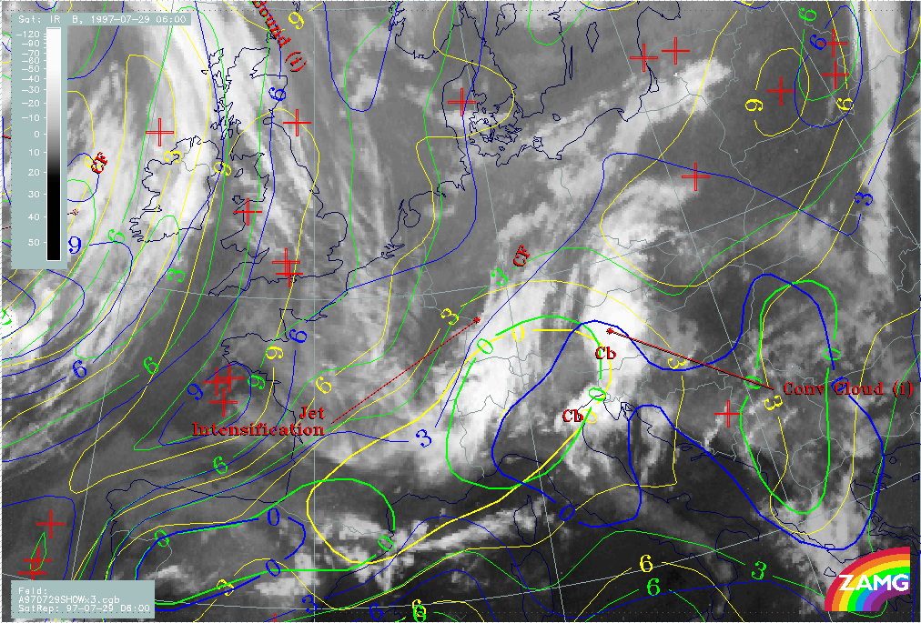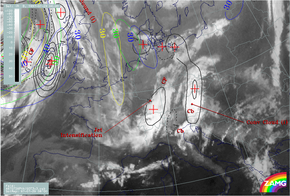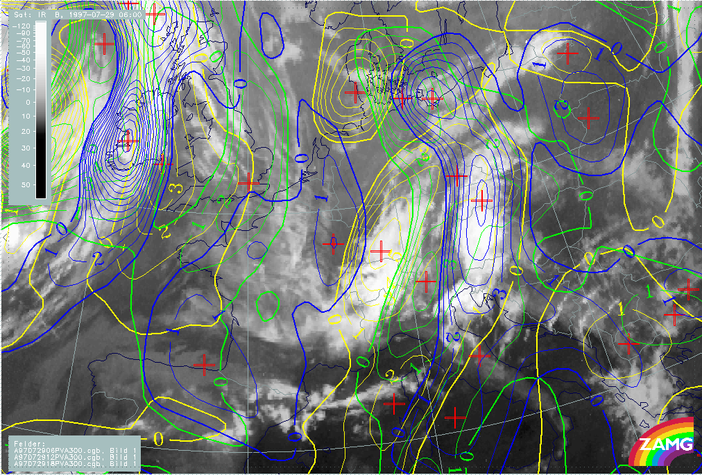 29 July 1997/06.00 UTC -Meteosat IR image; yellow: positive vorticity advection (PVA) 300 hPa 06.00 UTC, green: positive vorticity
