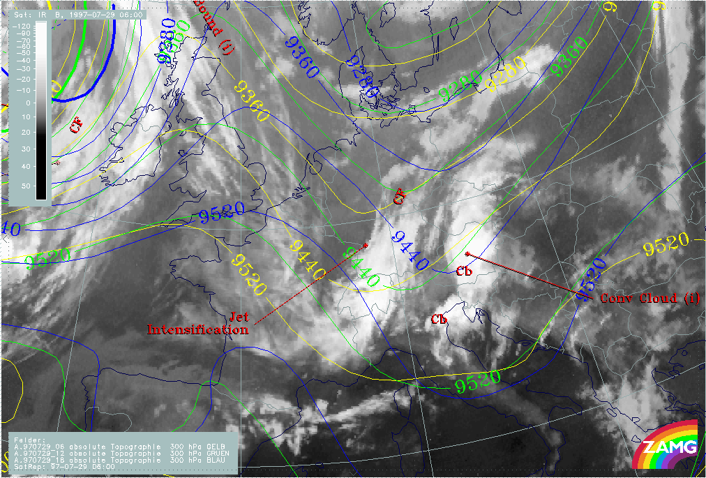 29 July 1997/06.00 UTC - Meteosat IR image; yellow: height contours 300 hPa 06.00 UTC, green: height contours 300 hPa 12.00 UTC, blue: