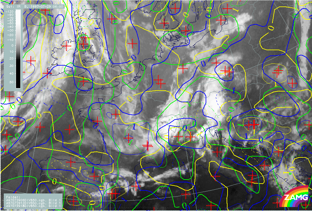 29 July 1997/06.00 UTC - Meteosat IR image; yellow: divergence 850 hPa 06.00 UTC, green: divergence 850 hPa 12.00 UTC, blue: divergence
