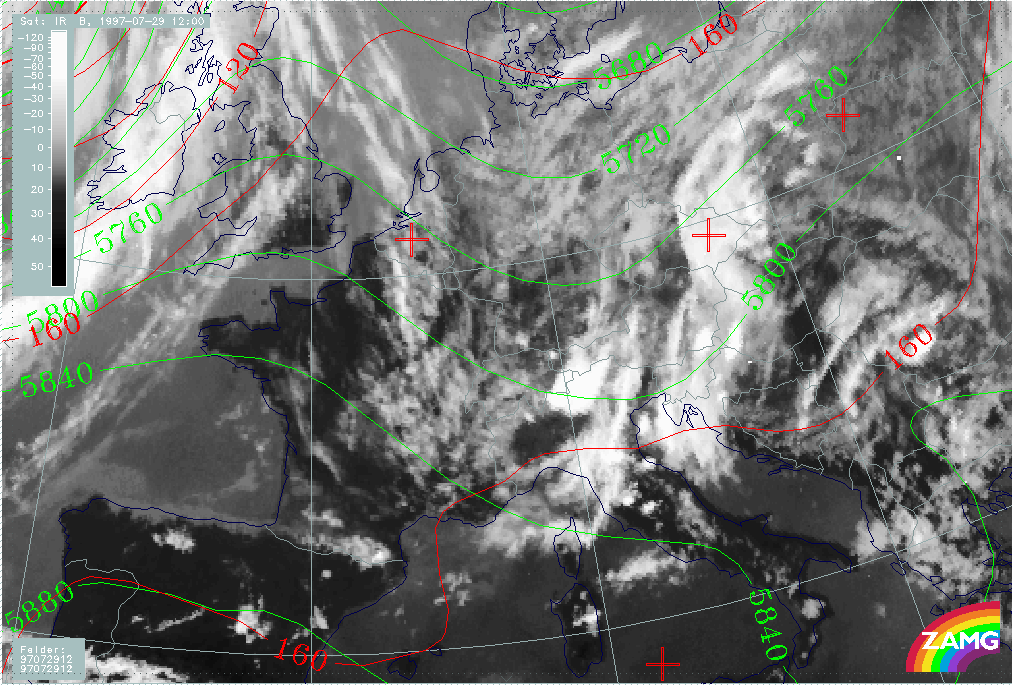29 July 1997/12.00 UTC - Meteosat IR image; red: height contours 1000 hPa, green: height contours 500 hPa