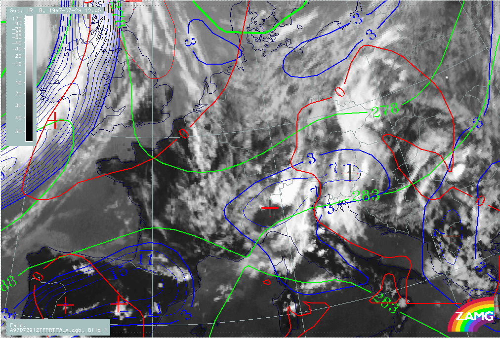 29 July 1997/12.00 UTC - Meteosat IR image; blue: thermal front parameter (TFP) 500/850 hPa, green: equivalent thickness 500/850 hPa,