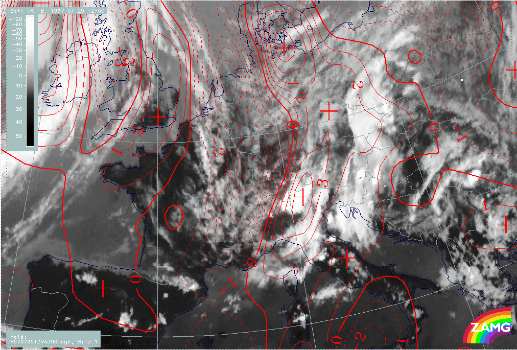 29 July 1997/12.00 UTC - Meteosat IR image; red: vorticity advection 300 hPa