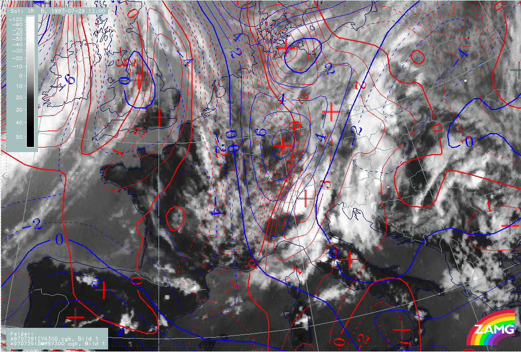 29 July 1997/12.00 UTC -Meteosat IR image; red: vorticity advection 300 hPa, blue: shear vorticity 300 hPa