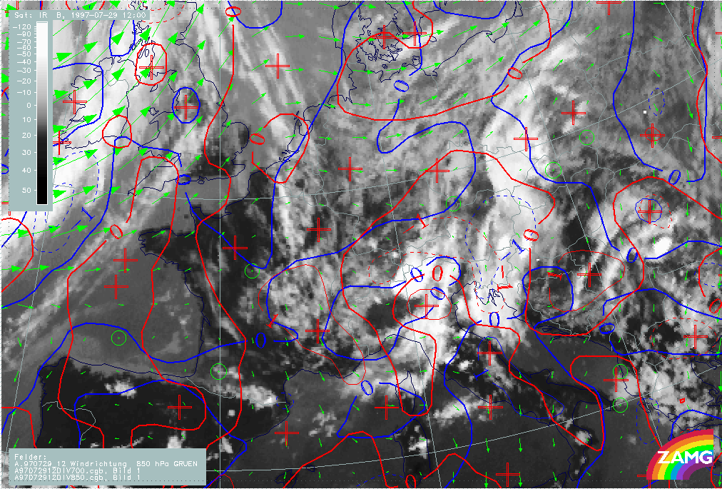 29 July 1997/12.00 UTC - Meteosat IR image; red: divergence 850 hPa, blue: divergence 700 hPa, green: wind vectors 850 hPa