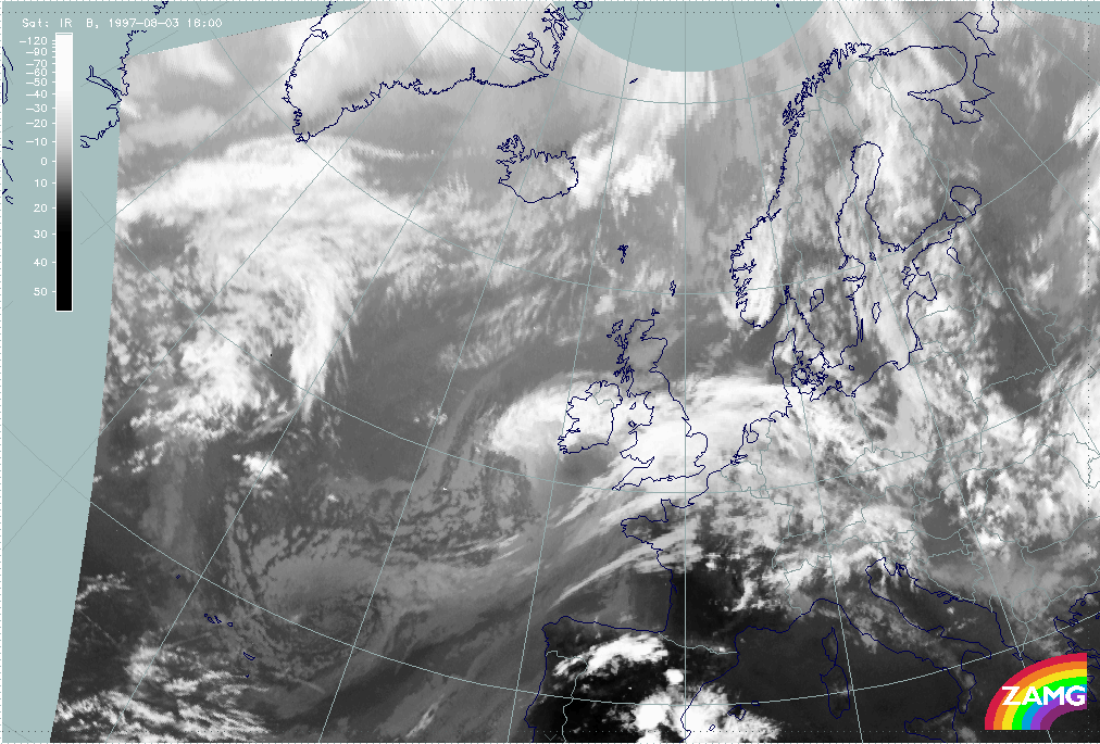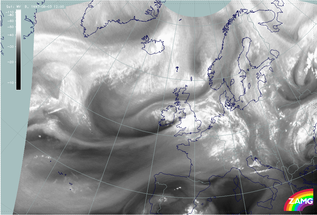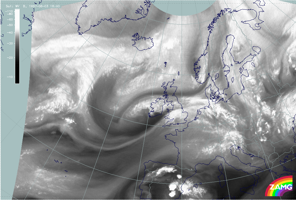 As can be seen from the IR (left and right image top) and WV images (left and right image bottom) a very intensive Rapid Cyclogenesis develops between 12.00 and 18.00 UTC. The most pronounced features are the intensive broadening of the WV Dark Stripe and the lowering of the cloud tops there; this happens in an area immediately to the south of Ireland. On the other hand there is a dramatic intensification of the cloudiness mostly in cellular convective form over and north-west of Ireland.