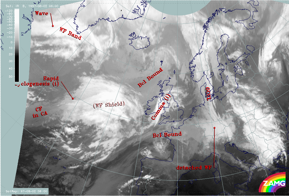 02 August 1997/06.00 UTC - Meteosat IR image; SatRep overlay: names of conceptual models