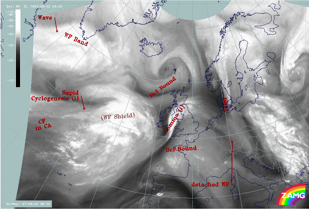 02 August 1997/06.00 UTC - Meteosat WV image; SatRep overlay: names of conceptual models