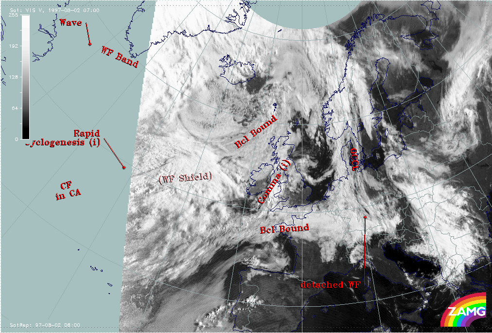 02 August 1997/07.00 UTC - Meteosat VIS image; SatRep overlay: names of conceptual models
