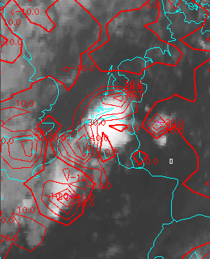 24 August 1997/21.00 UTC - Meteosat IR image; red: mean values of grey shades of cloud development and decay