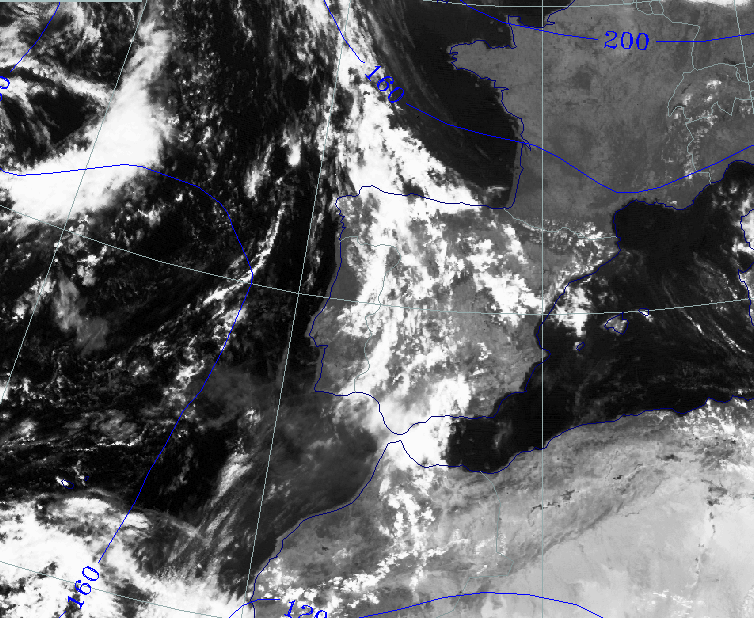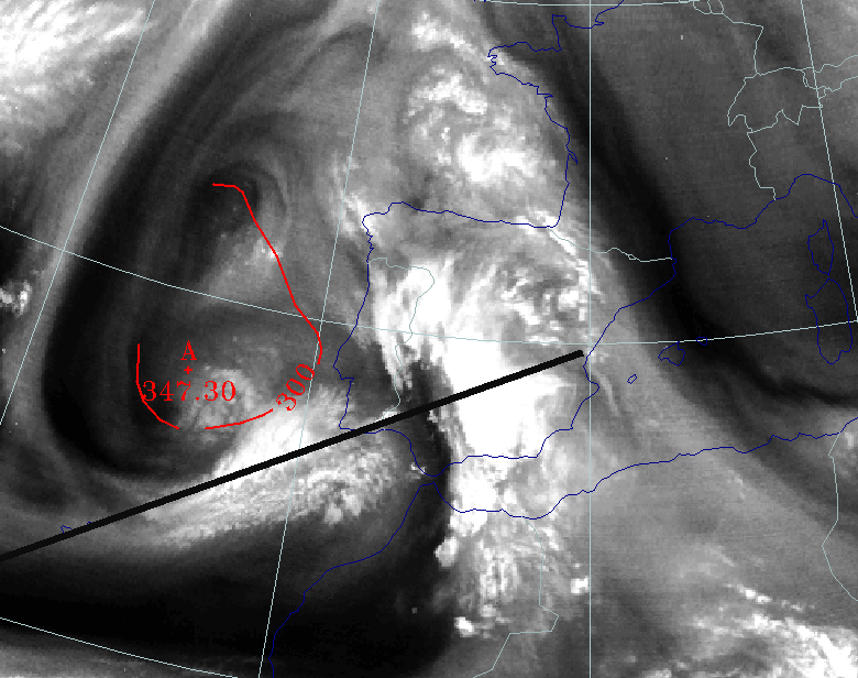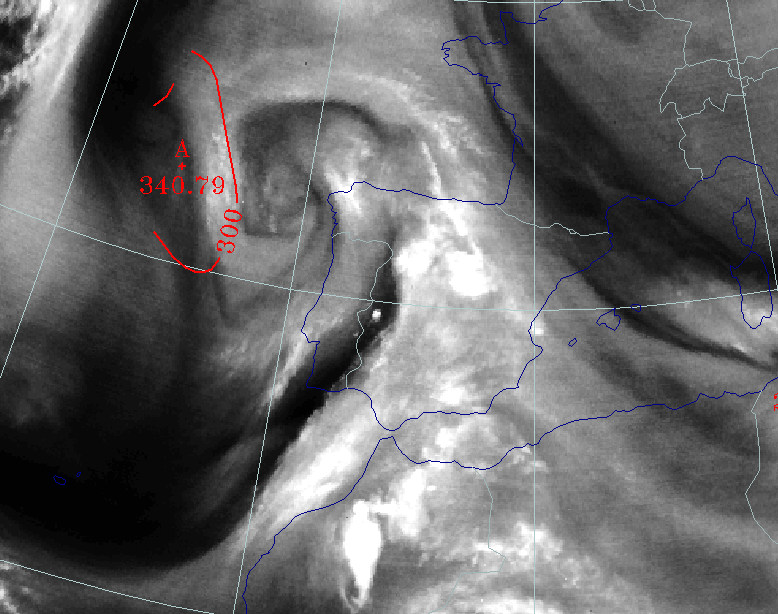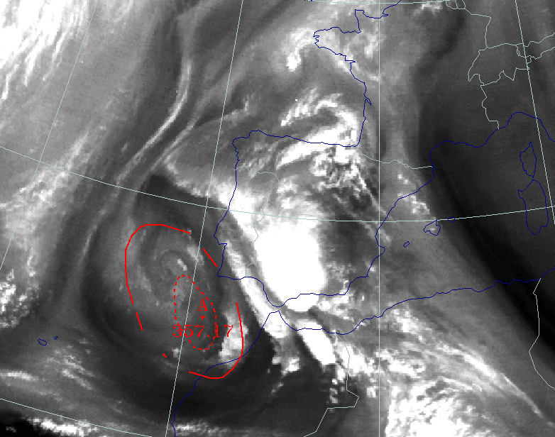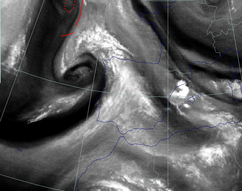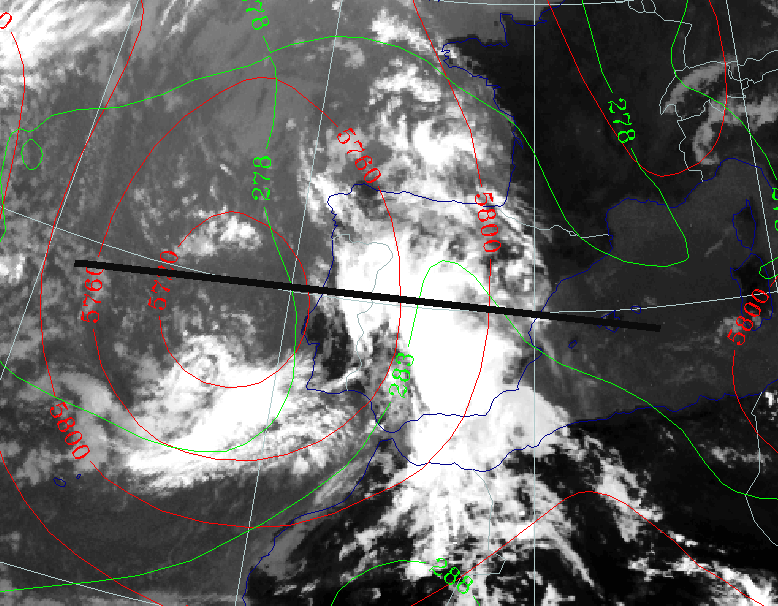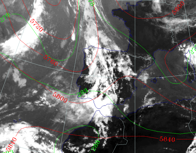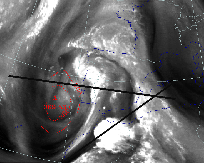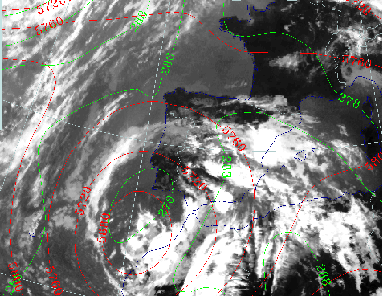 - There is cold advection over the Atlantic Ocean (the western part of Portugal). This can be seen in the isohypses at 500 hPa, which are perpendicular to the lines of equivalent thickness. This indicates that the ULL is still moving and developing.