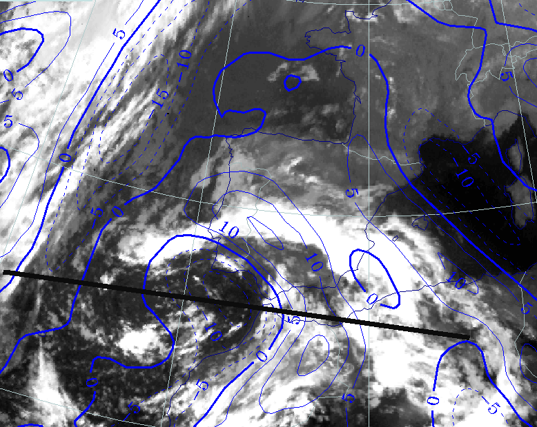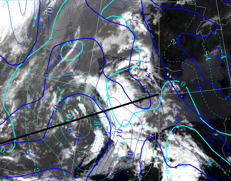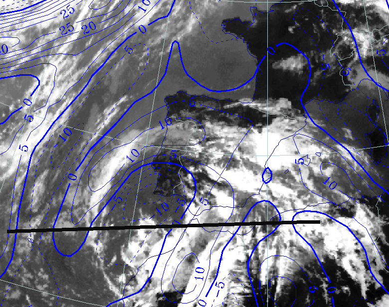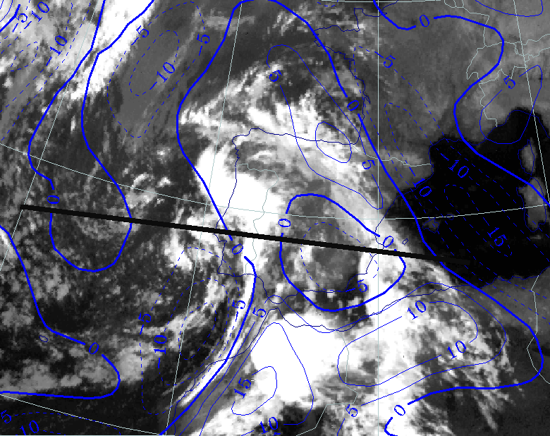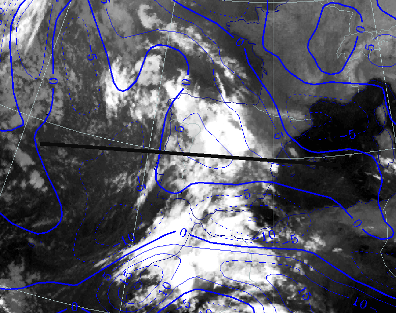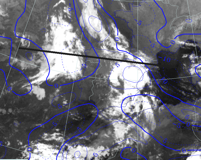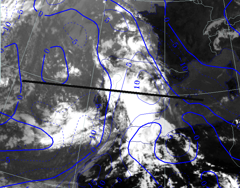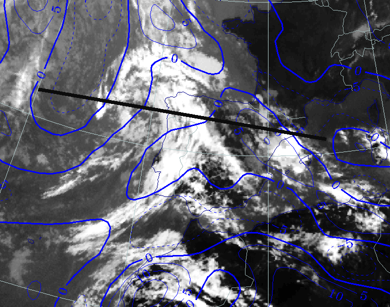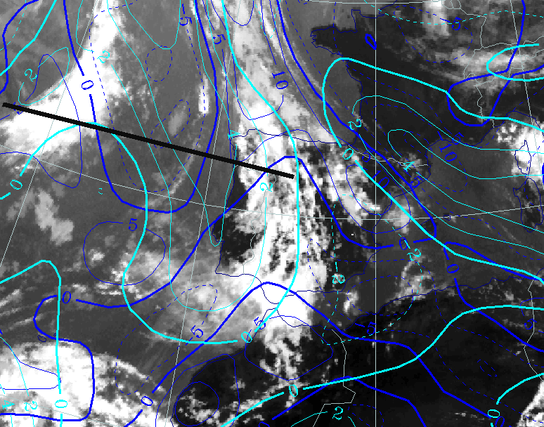 28 September 1997/12.00 UTC - Meteosat IR image; blue: thermal front parameter (TFP) 500/850 hPa; position of vertical cross section