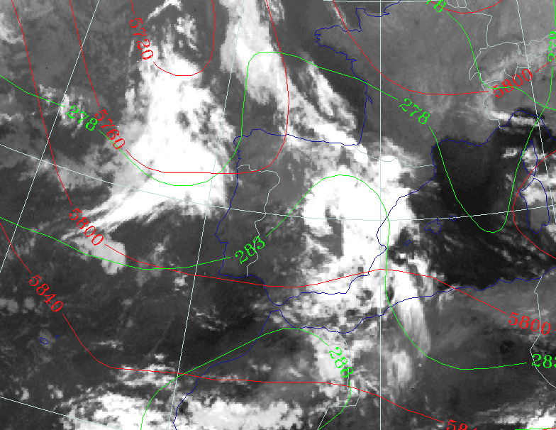 30 September 1997/00.00 UTC - Meteosat IR image; green: equivalent thickness 500/850 hPa, red: height contours 500 hPa