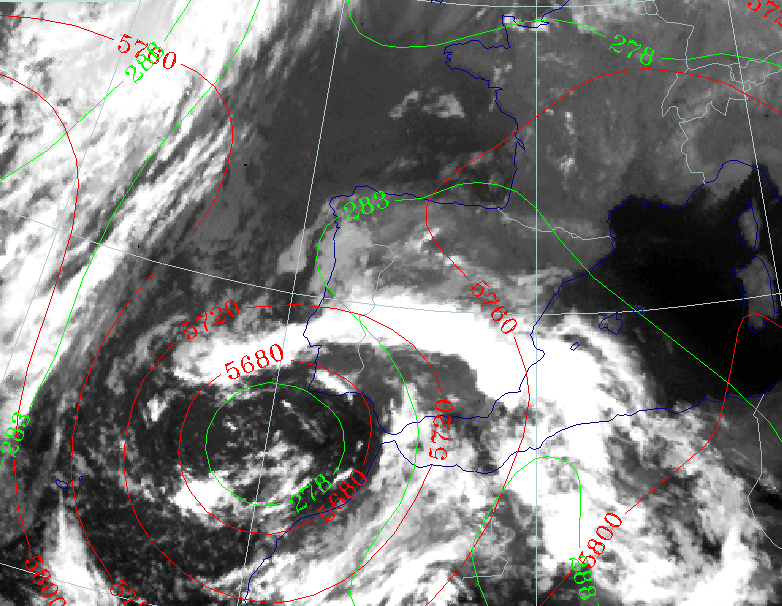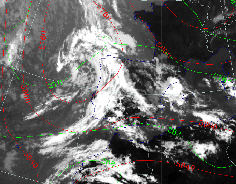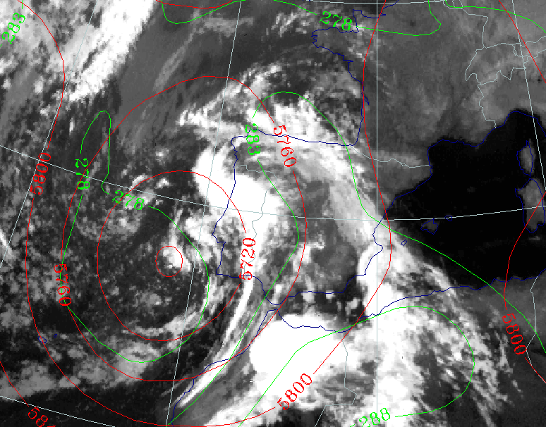 28 September 1997/00.00 UTC - Meteosat IR image; green: equivalent thickness 500/850 hPa, red: height contours 500 hPa
