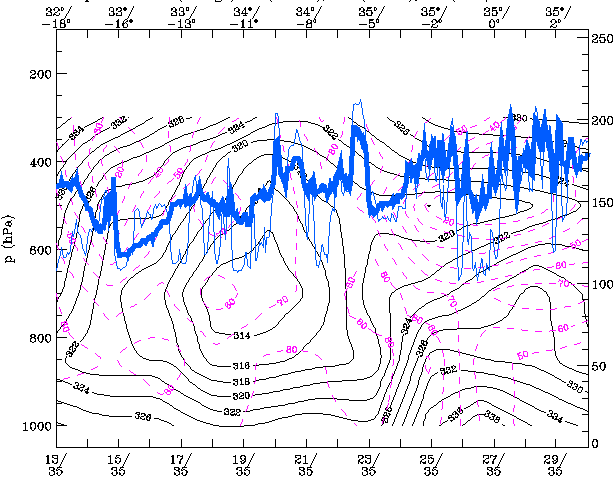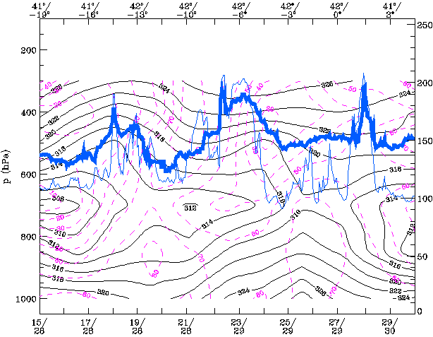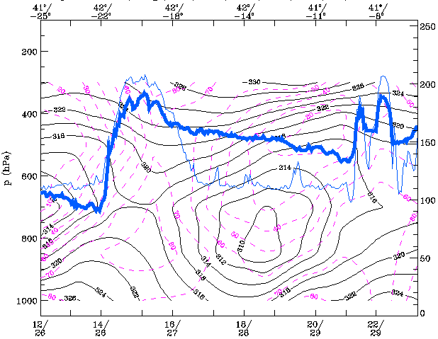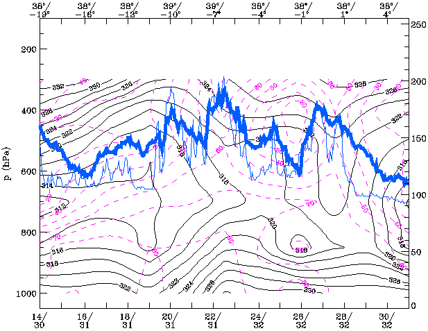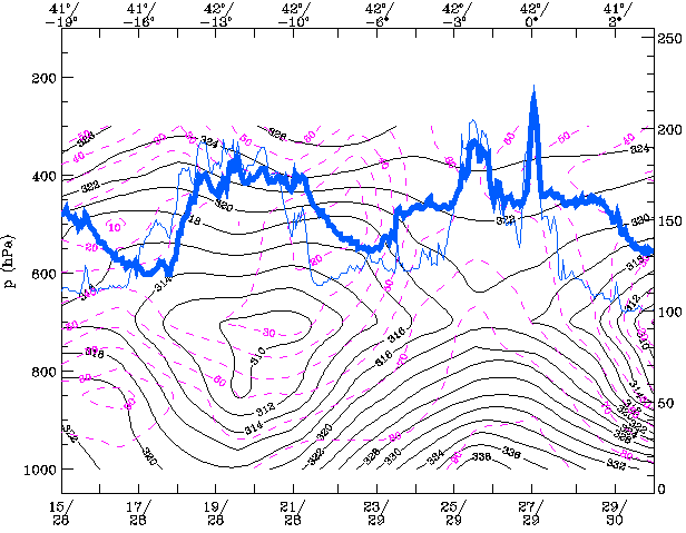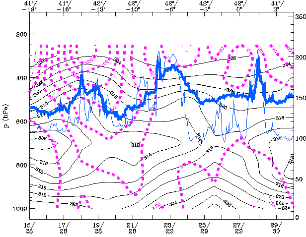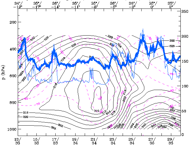 29 September 1997/00.00 UTC - Vertical cross section; black: isentropes (ThetaE), magenta: relative humidity, blue thin: IR pixel