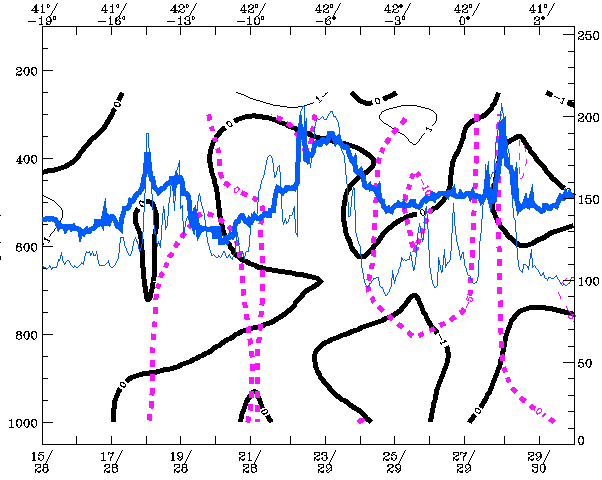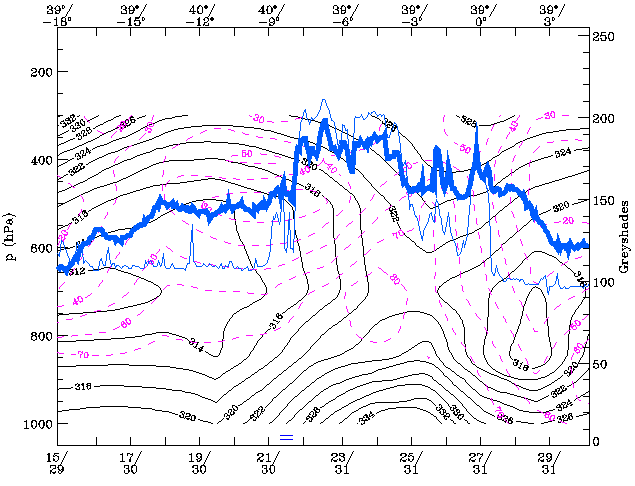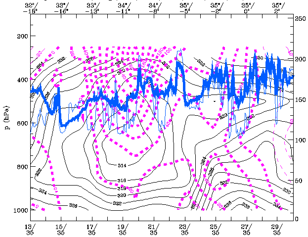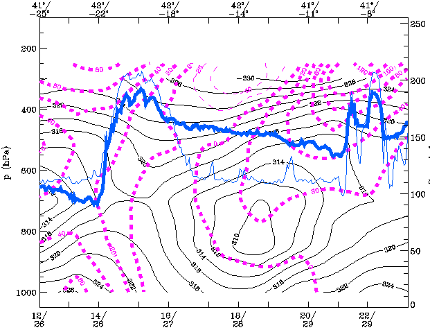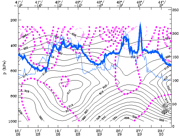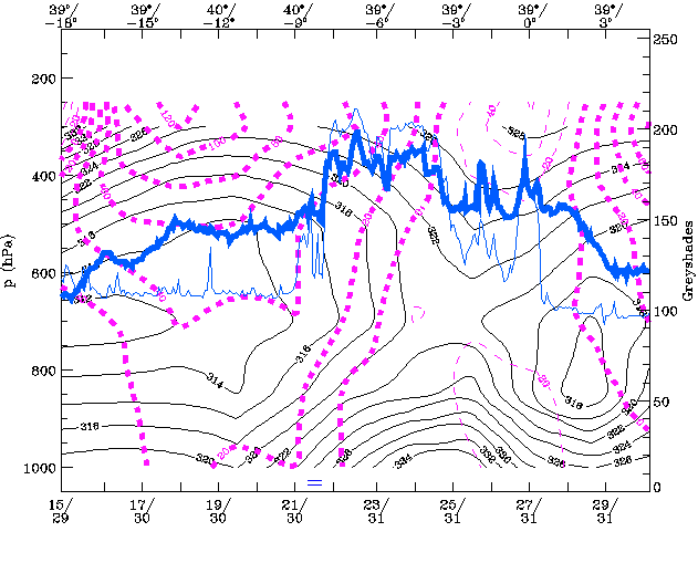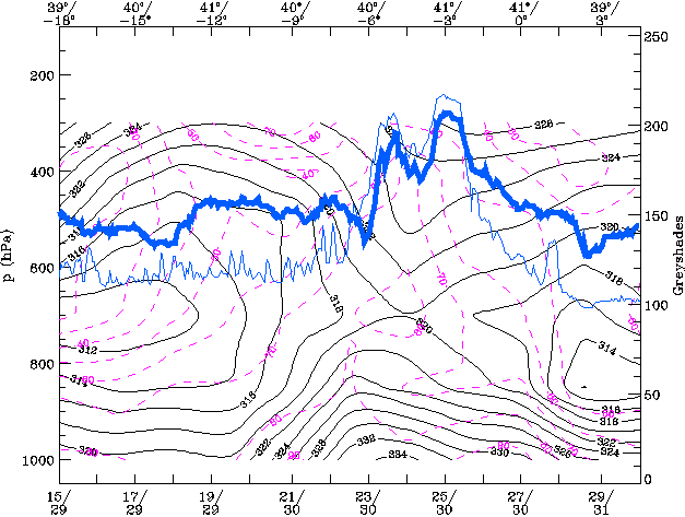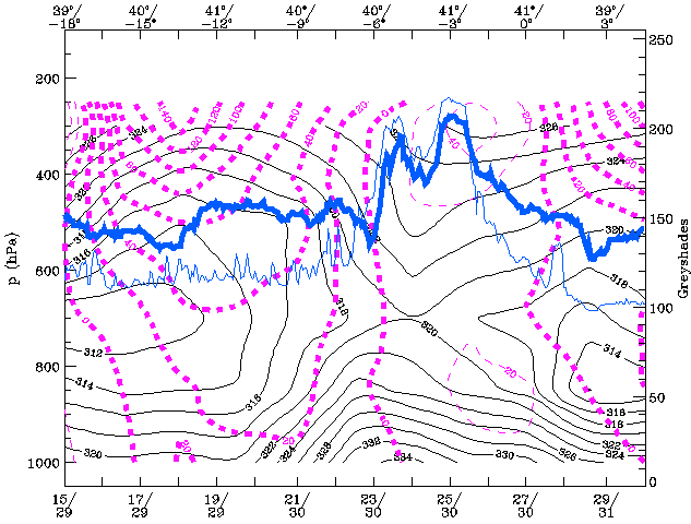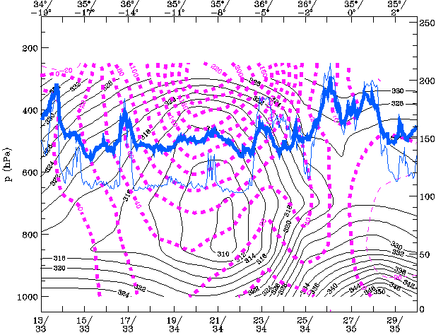 29 September 1997/00.00 UTC - Vertical cross section; black: isentropes (ThetaE), magenta: relative vorticity, blue thin: IR pixel