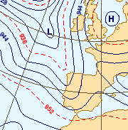 - The height contours are showing a closed circulation with minima of 576 gpdam. The fronts have lost their association with the cloud bands that extended in northern direction towards Greenland and Ireland. This indicates the tear-off stage of an Upper Level Low (Compare Conceptual Models: Upper Level Low - Meteorological physical background ).