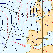 Between 40N and 50N, at a longitude of about 20W, a frontal zone is moving eastwards in the direction of the Iberian peninsula.
