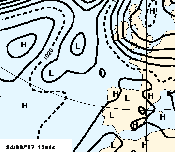 24 September 1997/12.00 UTC - Meteosat VIS image; blue: height contours 1000 hPa