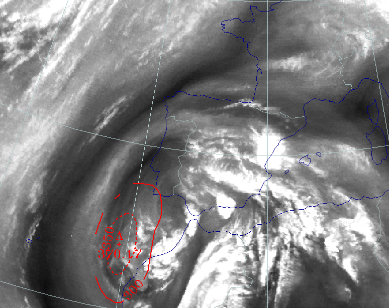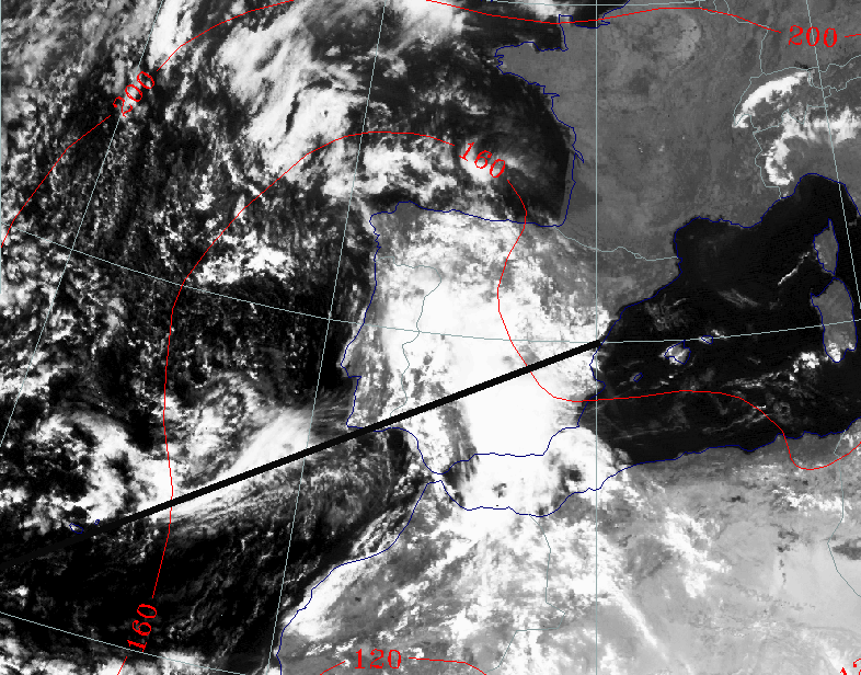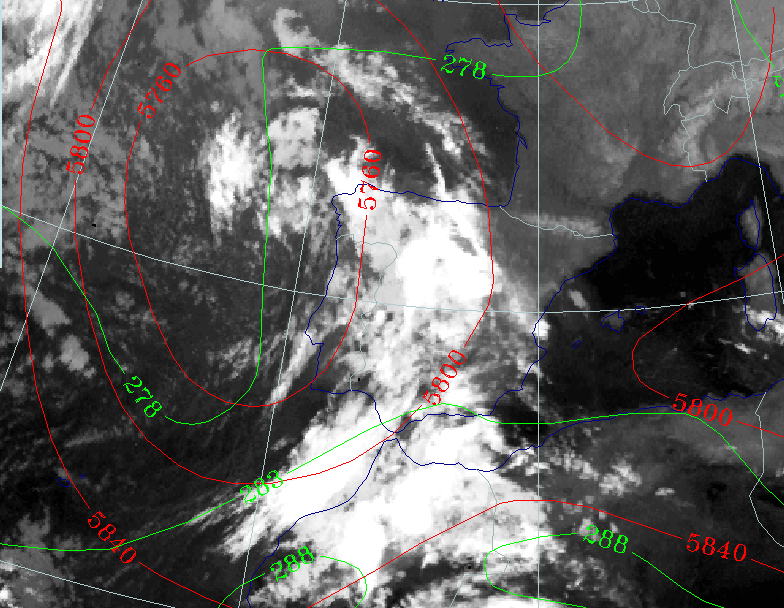 - An intense white spot can be seen at the west side of a thickness ridge above Morocco, indicating an MCS.