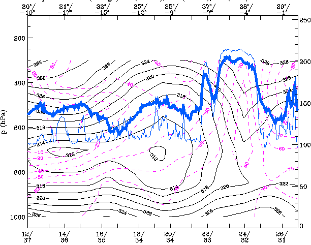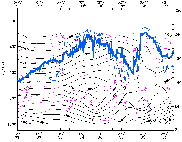 28 September 1997/12.00 UTC - Vertical cross section; black: isentropes (ThetaE), magenta: relative humidity, blue thin: IR pixel