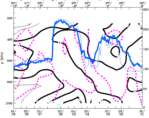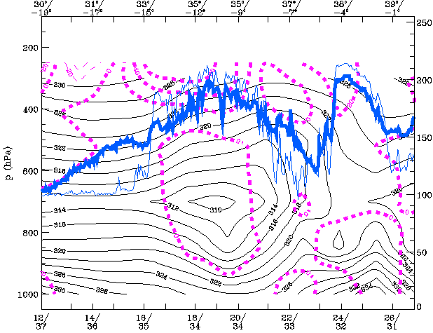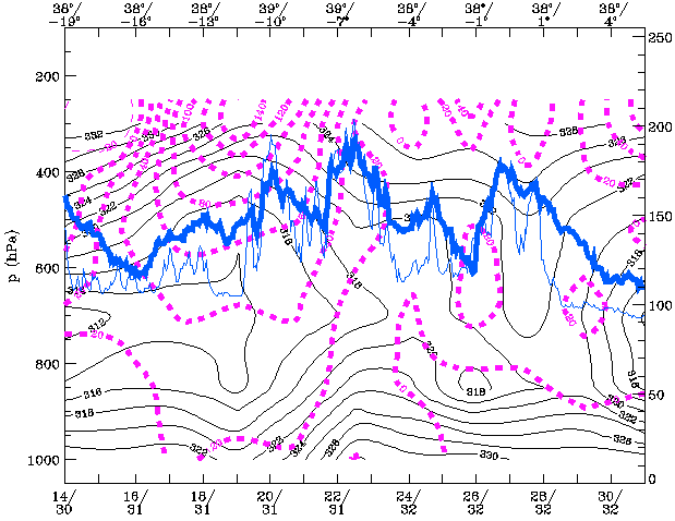 28 September 1997/00.00 UTC - Vertical cross section; black: isentropes (ThetaE), magenta: relative vorticity, blue thin: IR pixel