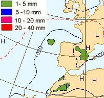 Biscay. A cluster of CBs is visible in the Barcelona area. The more westerly front is now over Portugal with still no clear indications in the