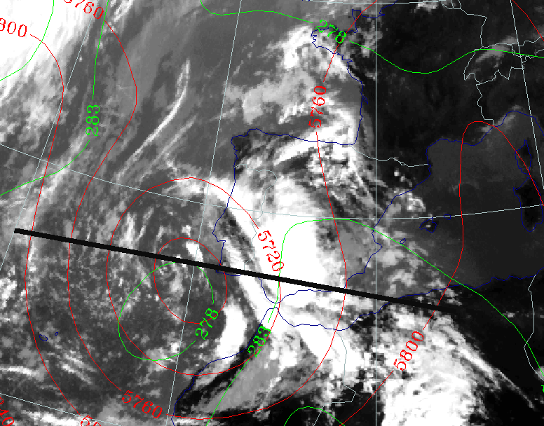 The front over Spain lies in the axis of a thickness ridge and, in the cross section, has the characteristics of an occlusion in the ThetaE pattern. This is also the case with the rapidly moving front over the Atlantic. To the rear of the first front, there is a trough visible in the height contours at 500 hPa and in the thickness pattern.