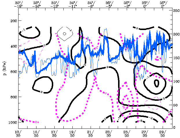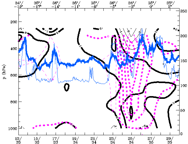 25 September 1997/12.00 UTC - Vertical cross section; black thin: divergence, black thick: convergence, magenta thick: vertical motion