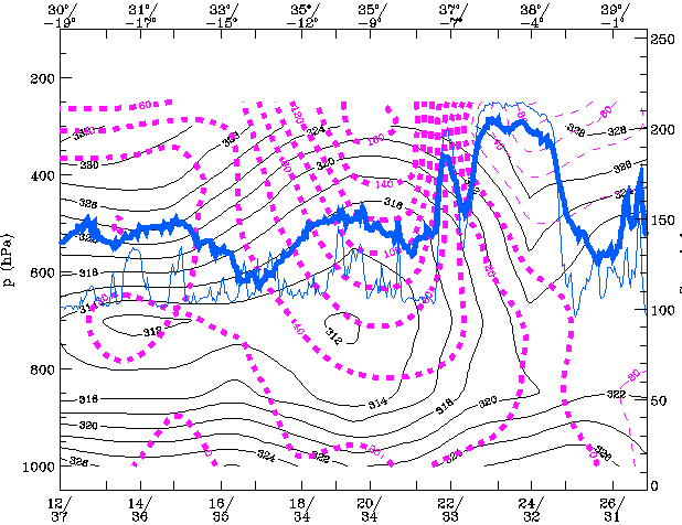 24 September 1997/12.00 UTC - Vertical cross section; black: isentropes (ThetaE), magenta: relative vorticity, blue thin: IR pixel