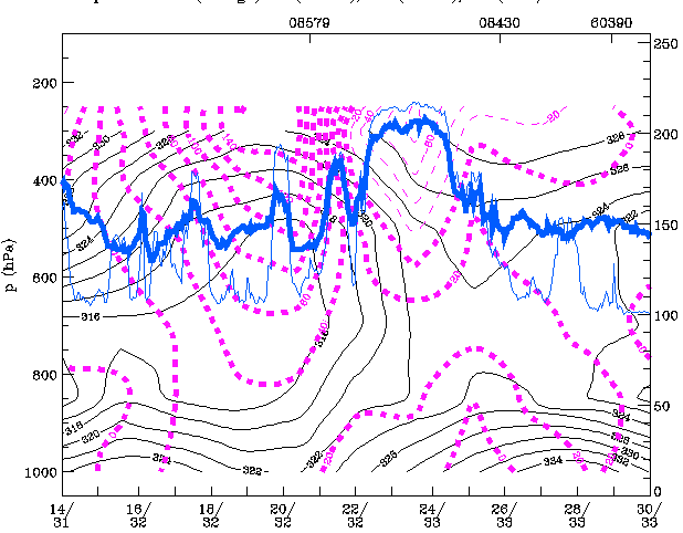 30 September 1997/00.00 UTC - Vertical cross section; black: isentropes (ThetaE), magenta: relative humidity, blue thin: IR pixel