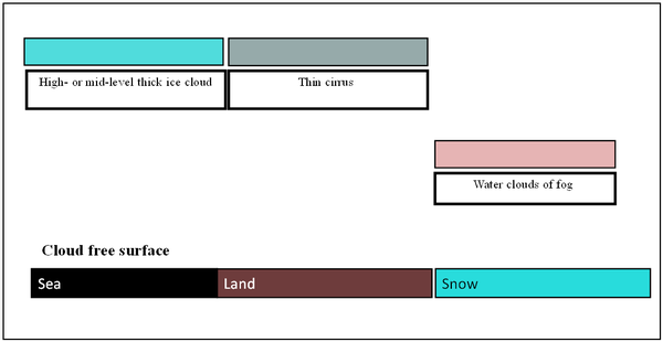 Fig. 6 shows the typical colours of the HRV Fog RGB images. The colours of the semitransparent clouds depend on many factors, for example on their thickness and on the colour of the underlying surface.