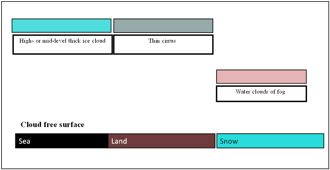 Water cloud, Cirrus, Snow on mountains, Snow free land, Sea