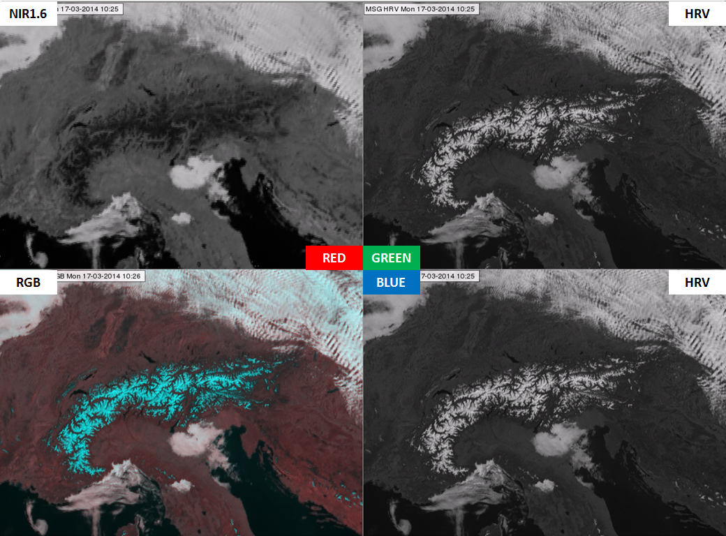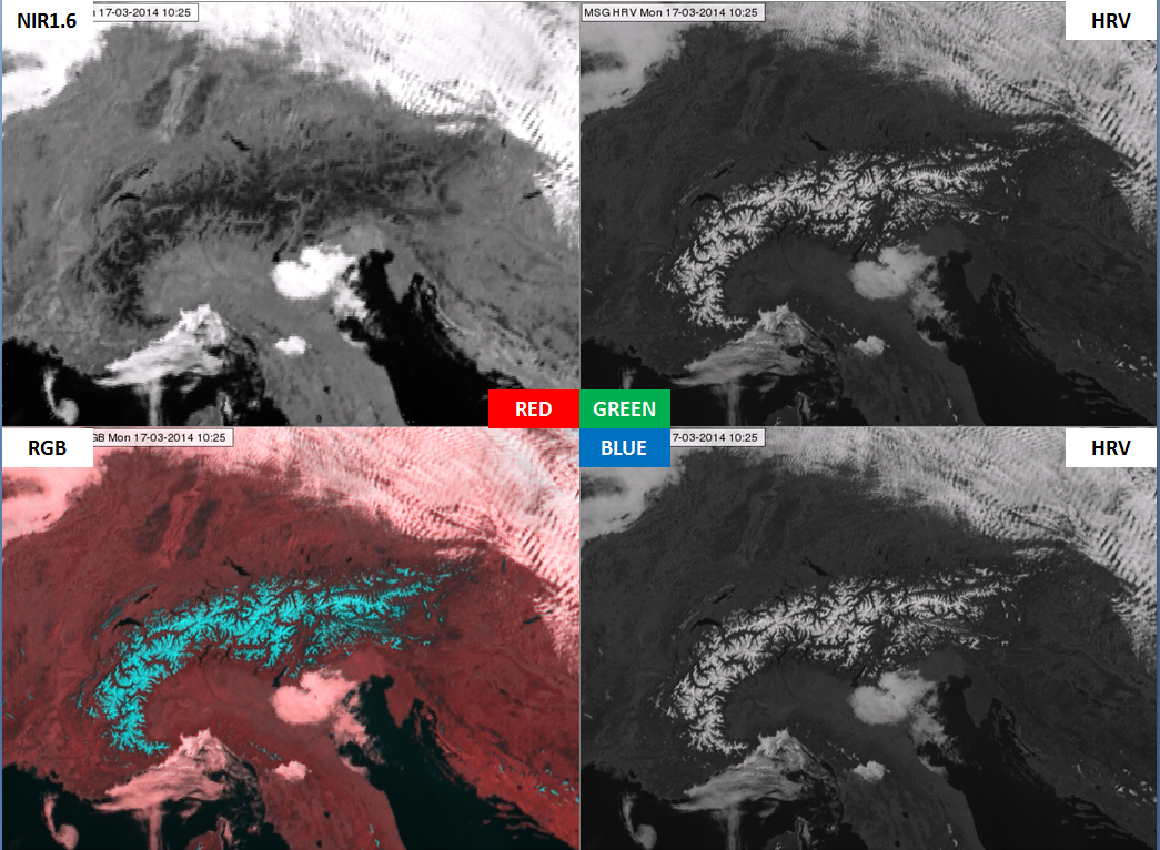 In Figs. 4a and 4b the HRV Fog RGB image can be compared with NIR1.6 and HRV images. One can see that the high resolution is coming from the HRV image, while the snow detection is enabled by the difference between the NIR1.6 and HRV channel data.