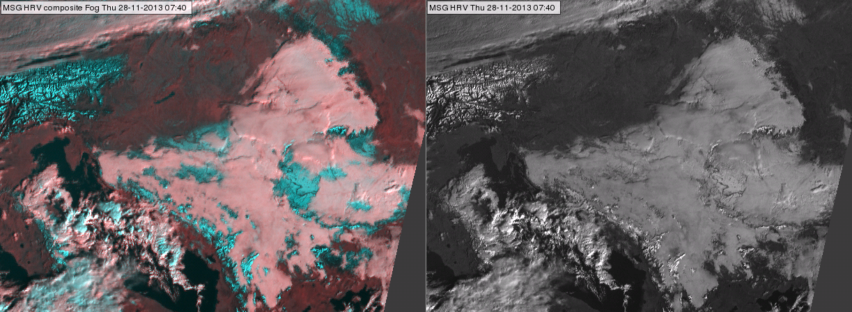| Figure 9: HRV Fog RGB (left) and HRV (right) image for 28 November 2013 at 07:40 UTC |